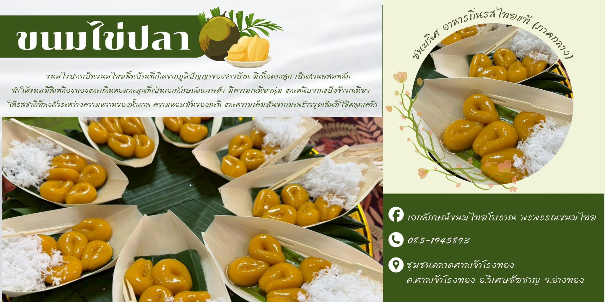 พช.วิเศษชัยชาญ ชวน ช็อป ชิม ผลิตภัณฑ์ OTOP จากหมู่บ้านท่องเที่ยวนวัตวิถี ชุมชนตลาดศาลเจ้าโรงทอง ตำบลศาลเจ้าโรงทอง อำเภอวิเศษชัยชาญ จังหวัดอ่างทอง ขอแนะนำ “ขนมไข่ปลา” เป็นขนมไทยพื้นบ้านที่เกิดจากภูมิปัญญาของชาวบ้าน มีเนื้อตาลสุก เป็นส่วนผสมหลักทำให้ขนมมิสิเหลืองทองและกลิ่นหอมละมุนที่เป็นเอกลักษณ์เฉพาะตัว มีความเหนียวนุ่ม และหนึบจากแป้งข้าวเหนียวให้รสชาติที่ลงตัวระหว่างความหวานของน้ำตาล ความหอมมันของกะทิ และความเค็มมันจากมะพร้าวขูดเส้นที่ใช้คลุกเคล้า